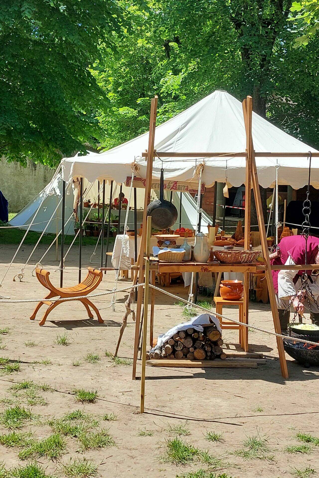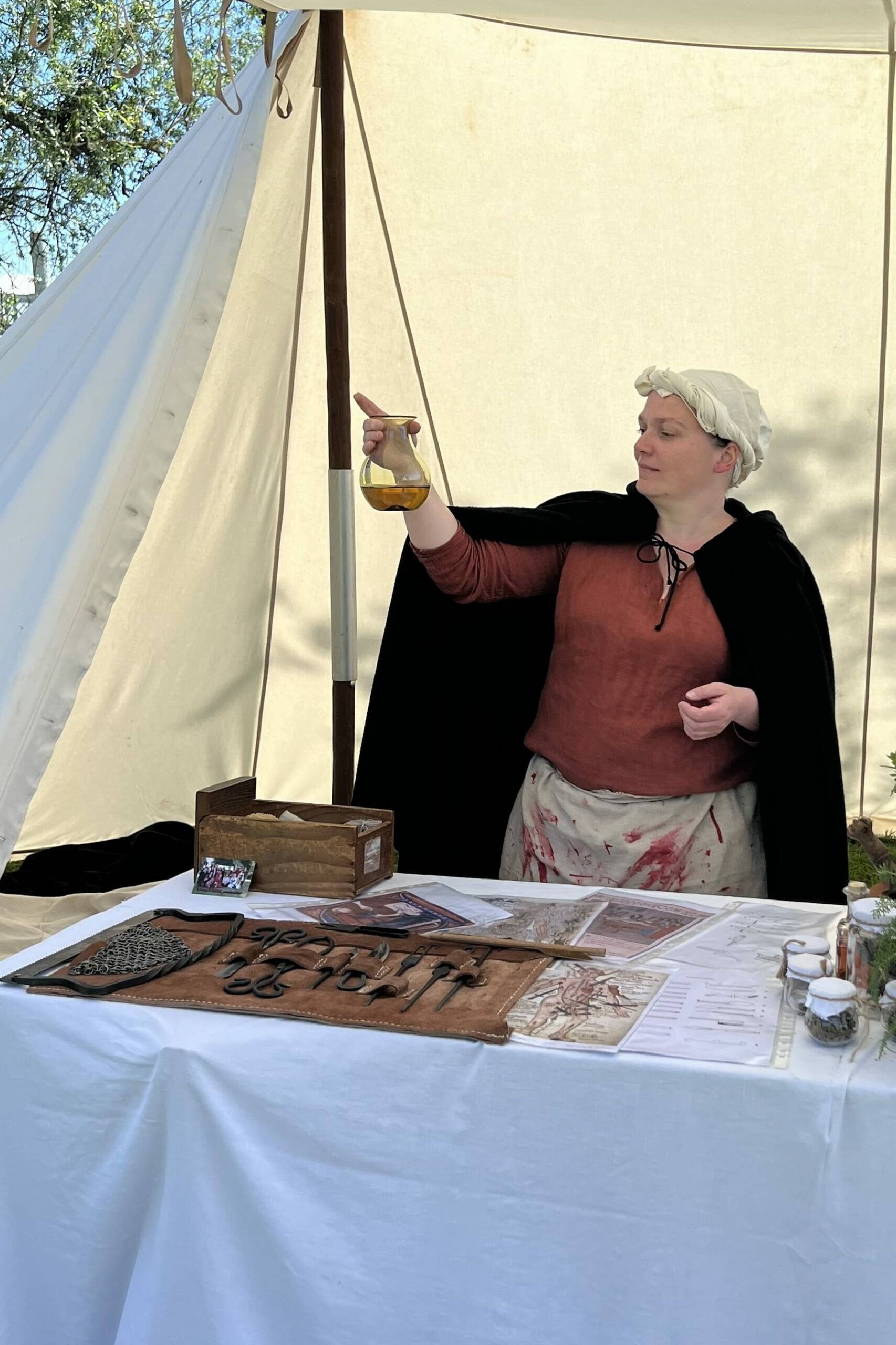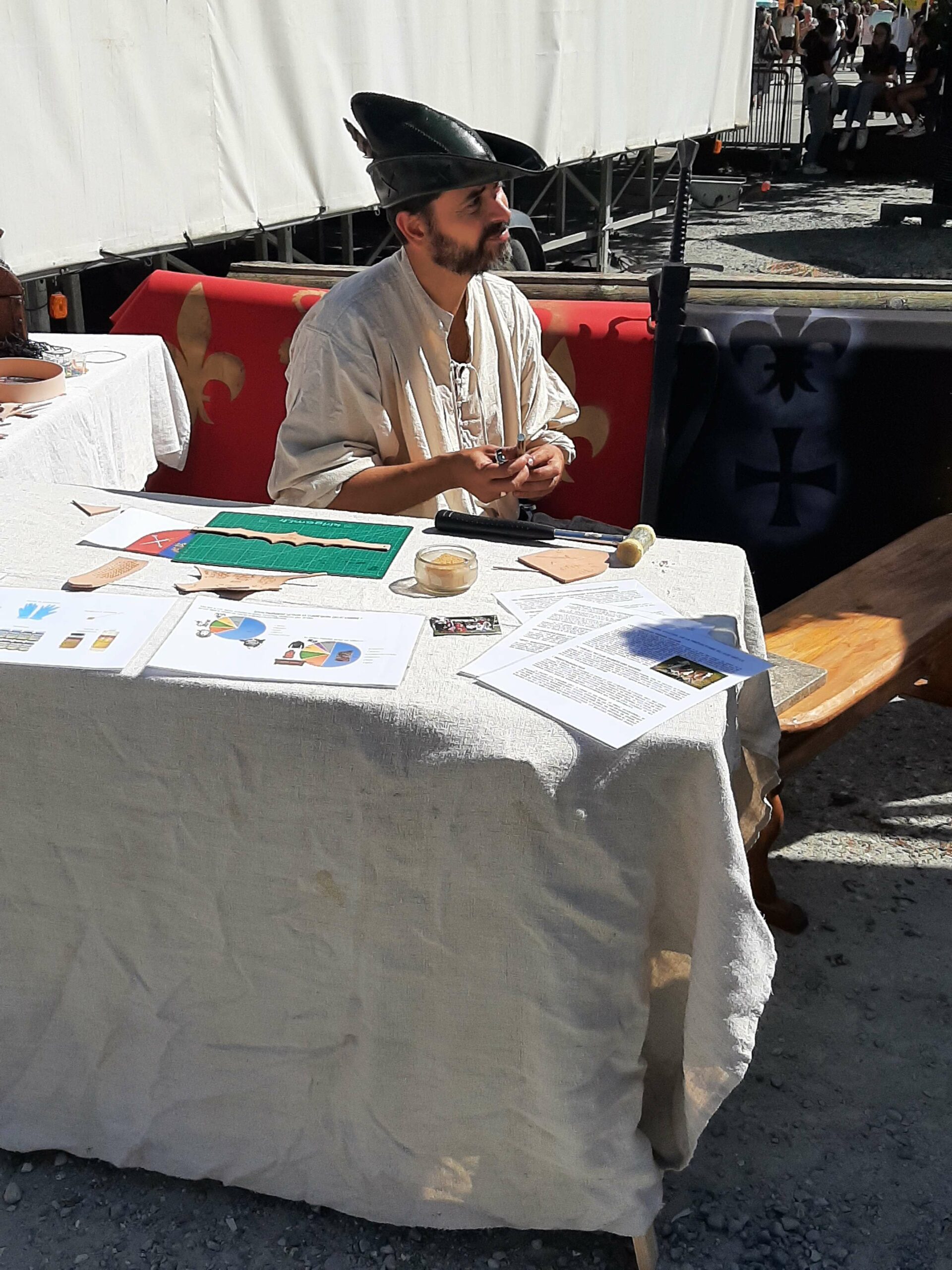 Lors des fêtes médiévales, l’artisan du cuir propose des démonstrations de fabrication d’objets en cuir, tout en expliquant les différentes techniques utilisées. Il peut également inviter le public à manipuler certains outils afin de personnaliser des articles tels que des diadèmes ou des porte-clés.