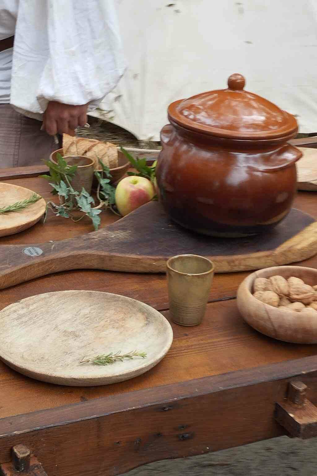 Devant sa cuisine, le maître queux présente au public les recettes du jour et les coutumes culinaires d'alors, des herbes aux épices, du repas du commun à la table haute.